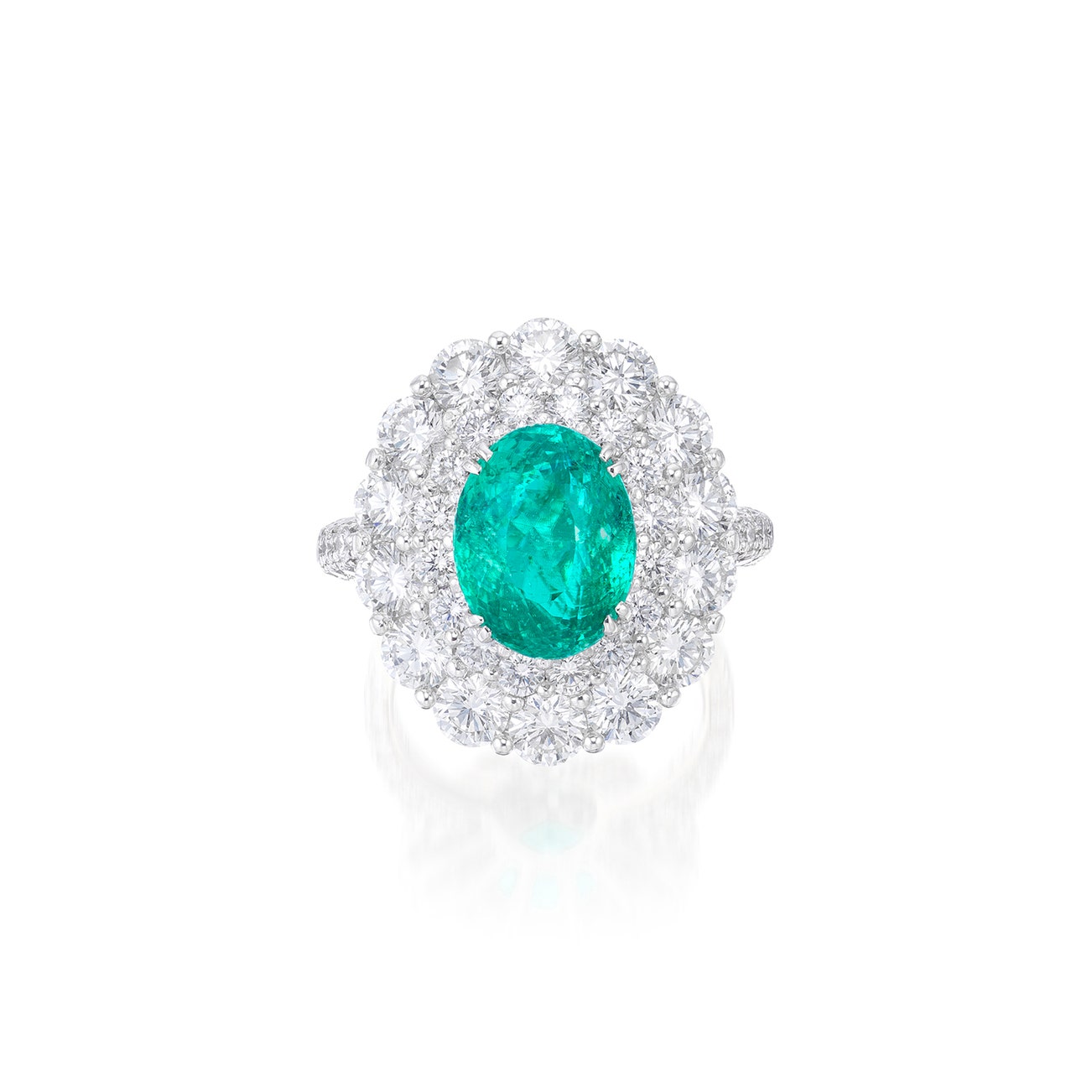 Set with an oval Paraíba tourmaline weighing approximately 3.70 carats, to the brilliant-cut diamond surrounds and shoulders, mounted in platinum, size 5¾.