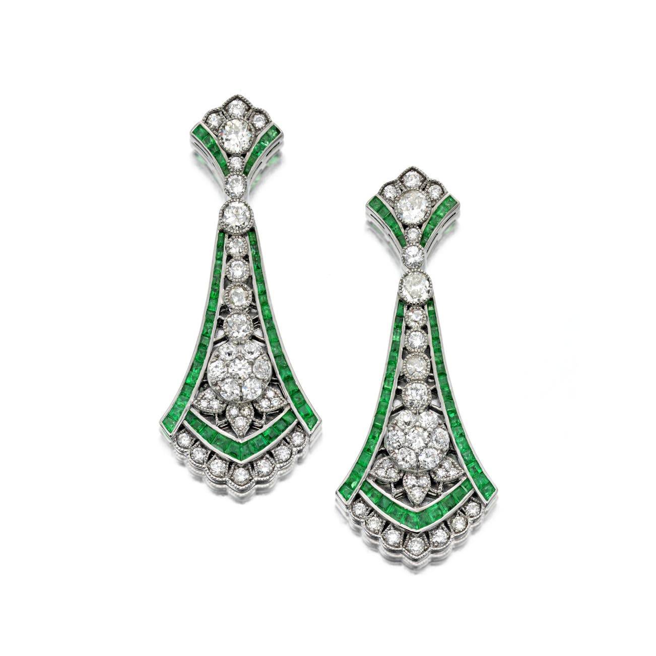 Each set with circular-, single- and brilliant-cut diamonds, highlighted with calibré-cut emeralds, mounted in 18k white gold, post and butterfly fittings, length approximately 1 3/4 inches.