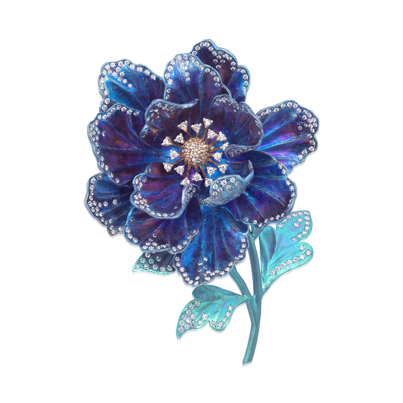 Of floral design, centring upon circular-cut diamonds of brown tint, petals, leaves and stem highlighted with brilliant-cut diamonds,