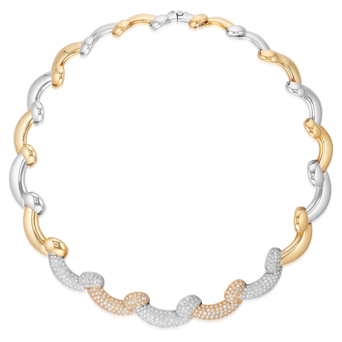 Of scroll design, decorated with brilliant-cut diamonds, mounted in white and yellow gold, length approximately 425 mm.