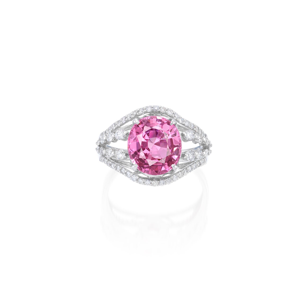 Set with an oval spinel weighing 4.10 carats, to the shoulders highlighted with brilliant-cut diamonds, mounted in platinum, size 7.
