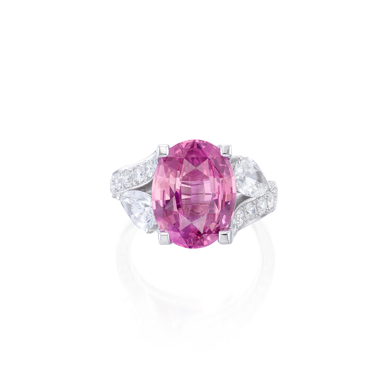 Set with an oval pink sapphire weighing 7.14 carats, between two pear-shaped diamonds each weighing 0.59 carat, to the brilliant-cut diamond shoulders and gallery, mounted in platinum, size 6½.