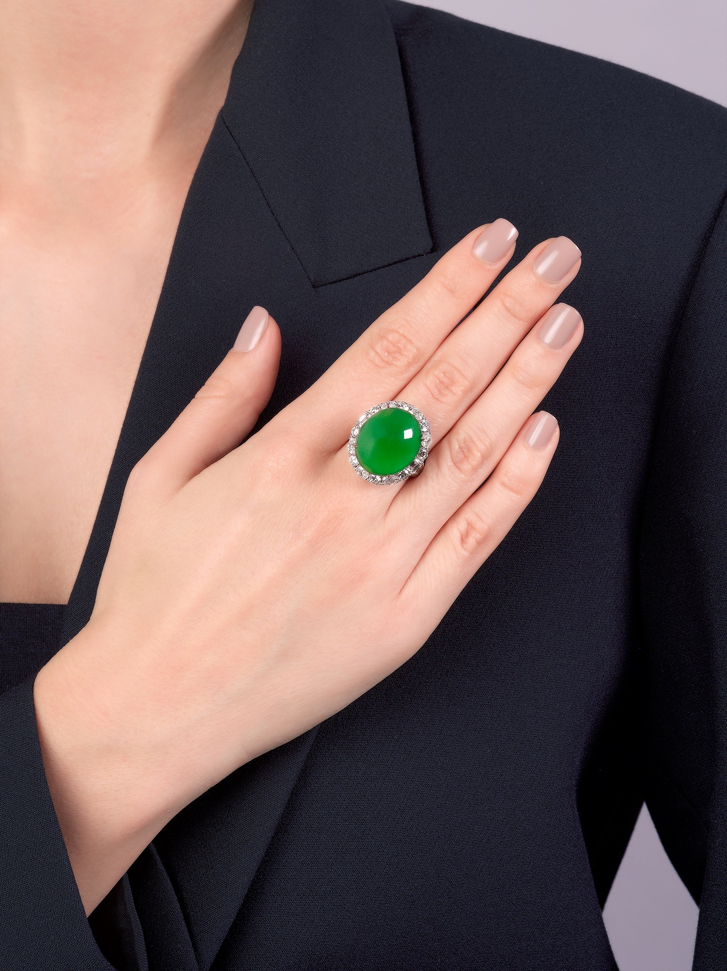 Set with an oval jadeite cabochon measuring approximately 19.24 x 16.17 x 6.40 mm, of intense green colour and good translucency, to variously shaped diamond surround, gallery and shoulders, mounted in white gold, size 6½.