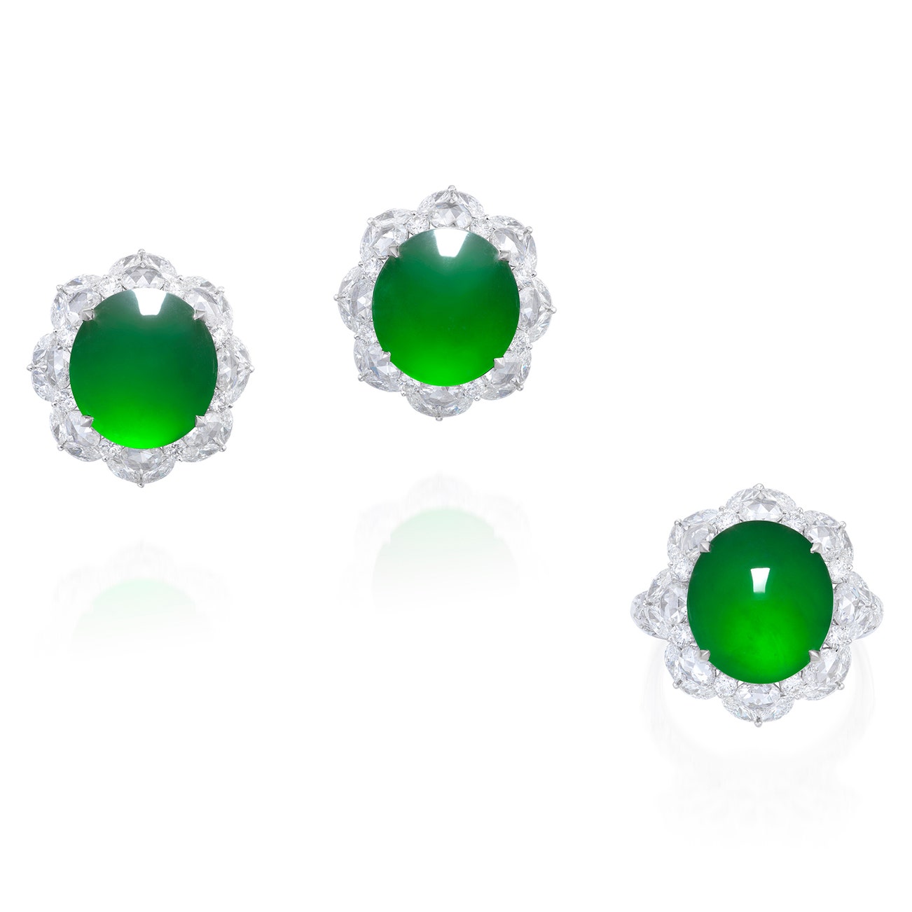 Comprising: a pair of earrings, each set with an oval jadeite cabochon of intense green colour and very good translucency, to the variously shaped diamond surround; and a ring en suite, all mounted in white gold, earrings post and butterfly fittings and length approximately 17 mm, ring size 6¼.