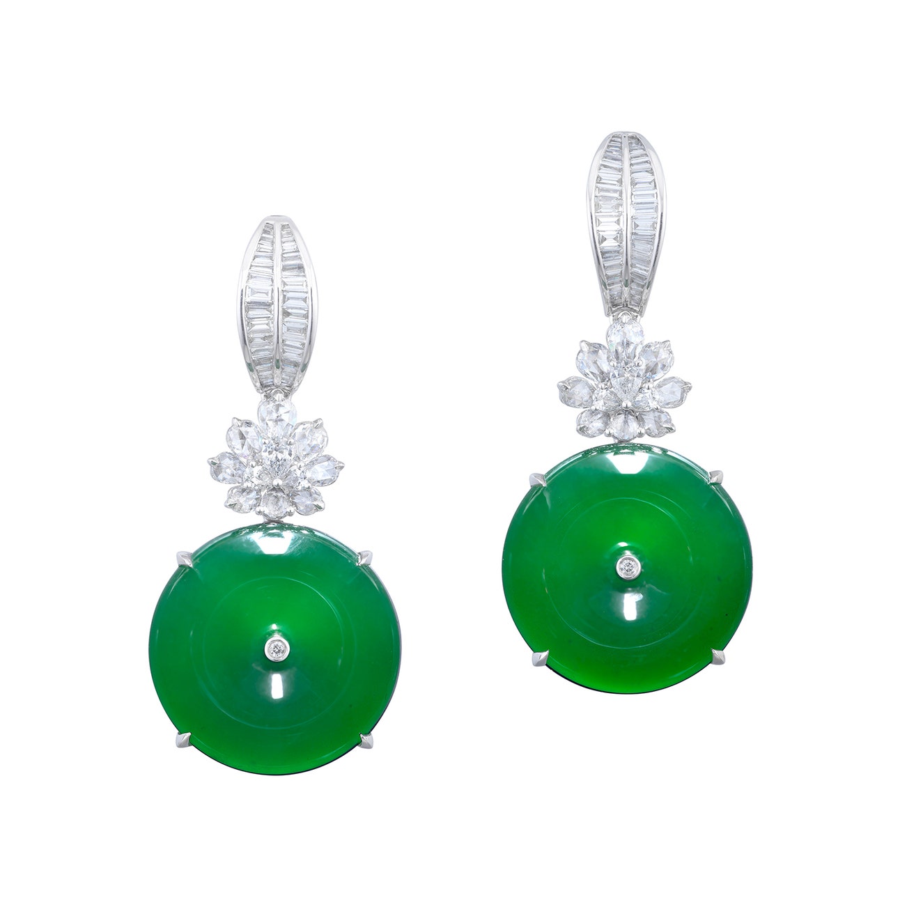 Each set with a jadeite huaigu, of bright green colour and very good translucency, to the diamond gallery and surmount, mounted in white gold, post and hinged back fittings, length approximately 39 mm.