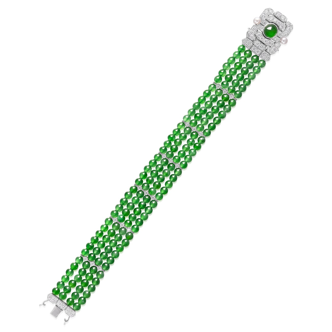 Composed of four rows of jadeite beads, the dividers set with brilliant-cut diamonds, completed by diamond-set clasp decorated with a jadeite cabochon and cultured pearls, mounted in platinum, length approximately 174 mm.