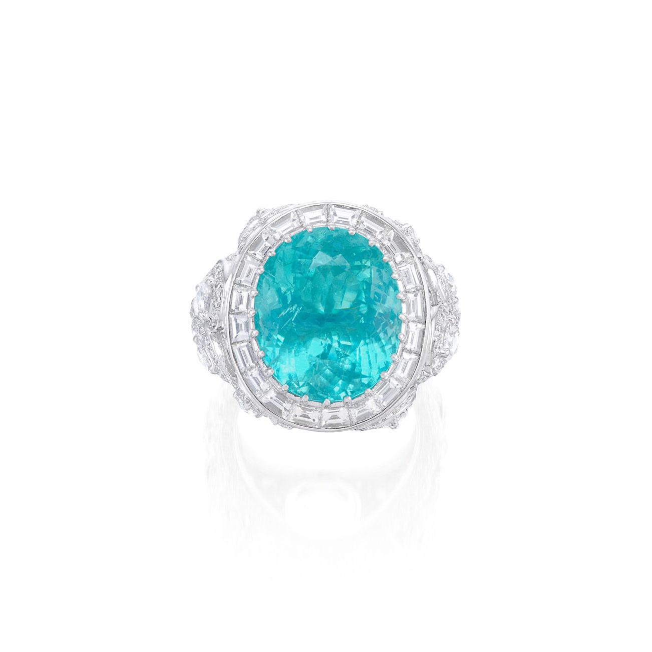 Set with an oval Paraíba-type tourmaline weighing 11.30 carats, within a trapeze-shaped diamond surround, to the scrolled shoulders and gallery set with rose- and brilliant-cut diamonds, mounted in white gold, size 6½.
