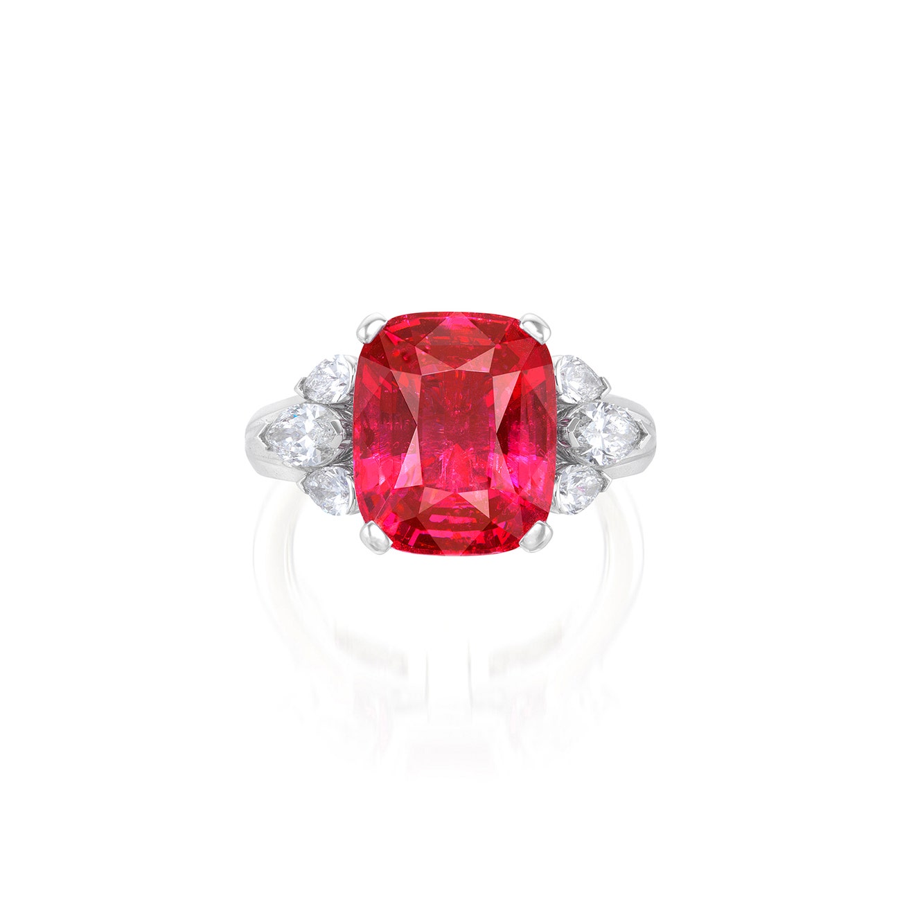 Set with a cushion-shaped spinel weighing 8.14 carats, between marquise- and pear-shaped diamonds, mounted in white gold, size 6¾.