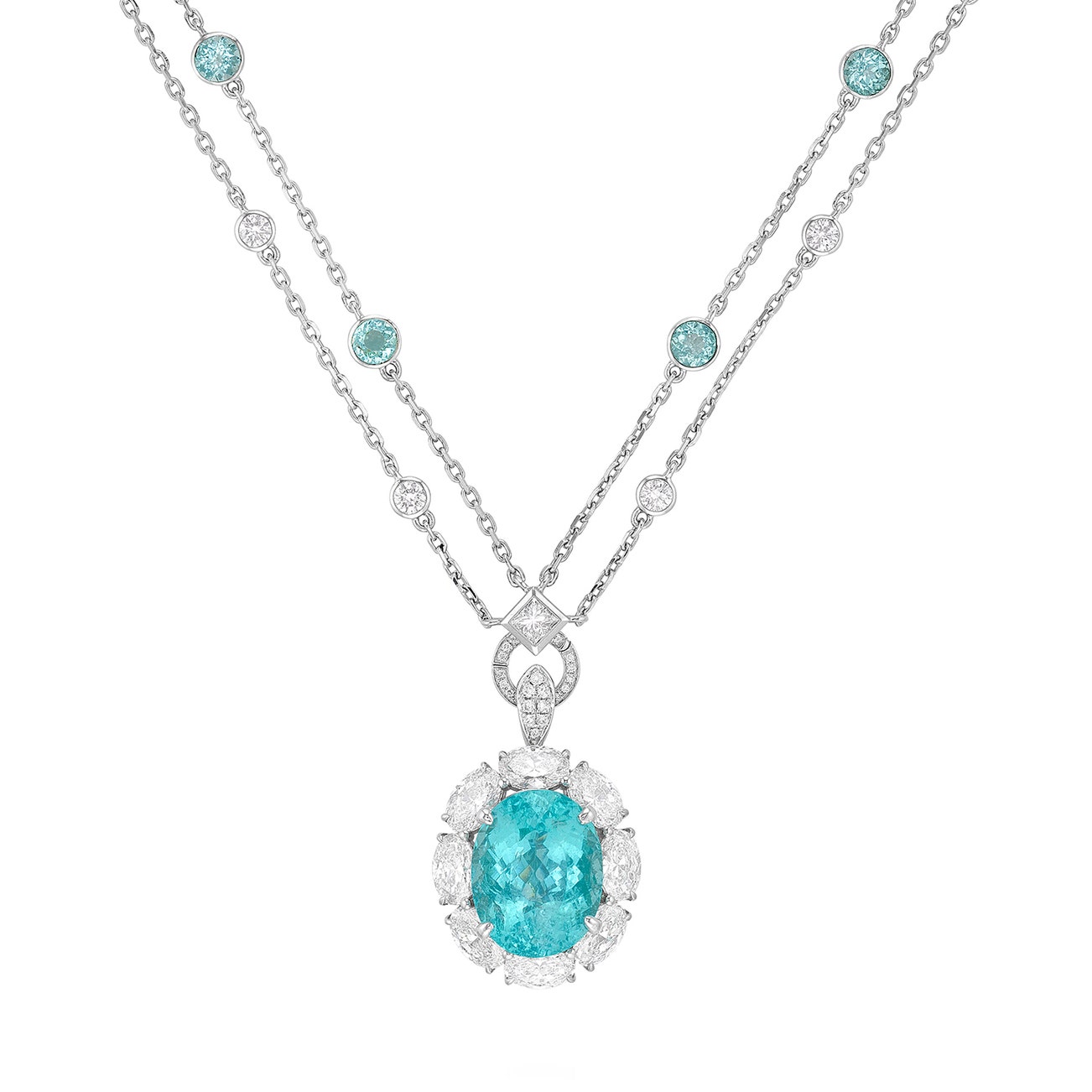 Set with an oval Paraíba-type tourmaline weighing 8.82 carats, to the oval diamond surround and diamond-set surmount, joined by double oval-link chain highlighted with collet-set Paraíba-type tourmalines and diamonds, mounted in white gold, pendant length approximately 27 mm, link chain length approximately 400 mm, pendant detachable and accompanied by a white gold ring fitting.