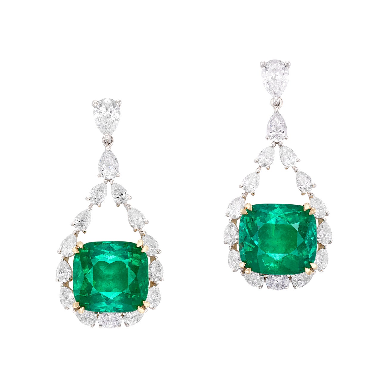 Each suspending a cushion-shaped emerald weighing approximately 13.18 and 13.14 carats respectively, decorated with pear-shaped and oval diamonds, mounted in white and yellow gold, post and butterfly fittings, length approximately 41 mm.