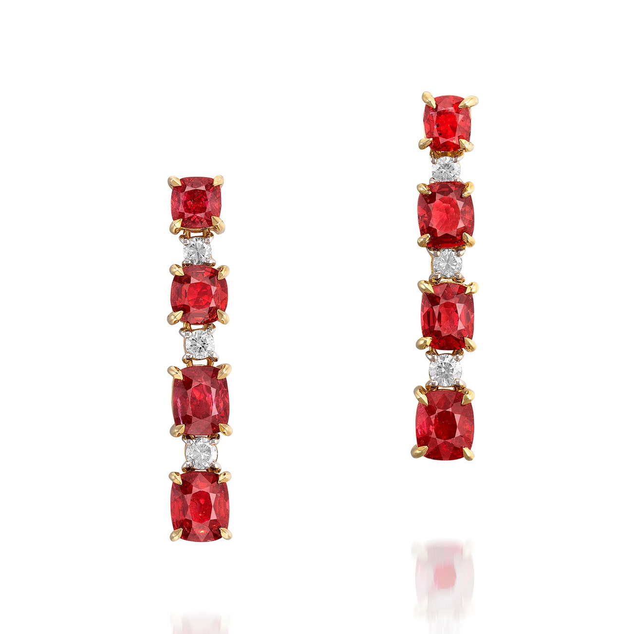 Each set with a line of four graduated cushion-shaped red spinels weighing a total of approximately 6.94 carats, spaced by brilliant-cut diamonds, mounted in yellow gold, post and butterfly fittings, length approximately 33 mm.