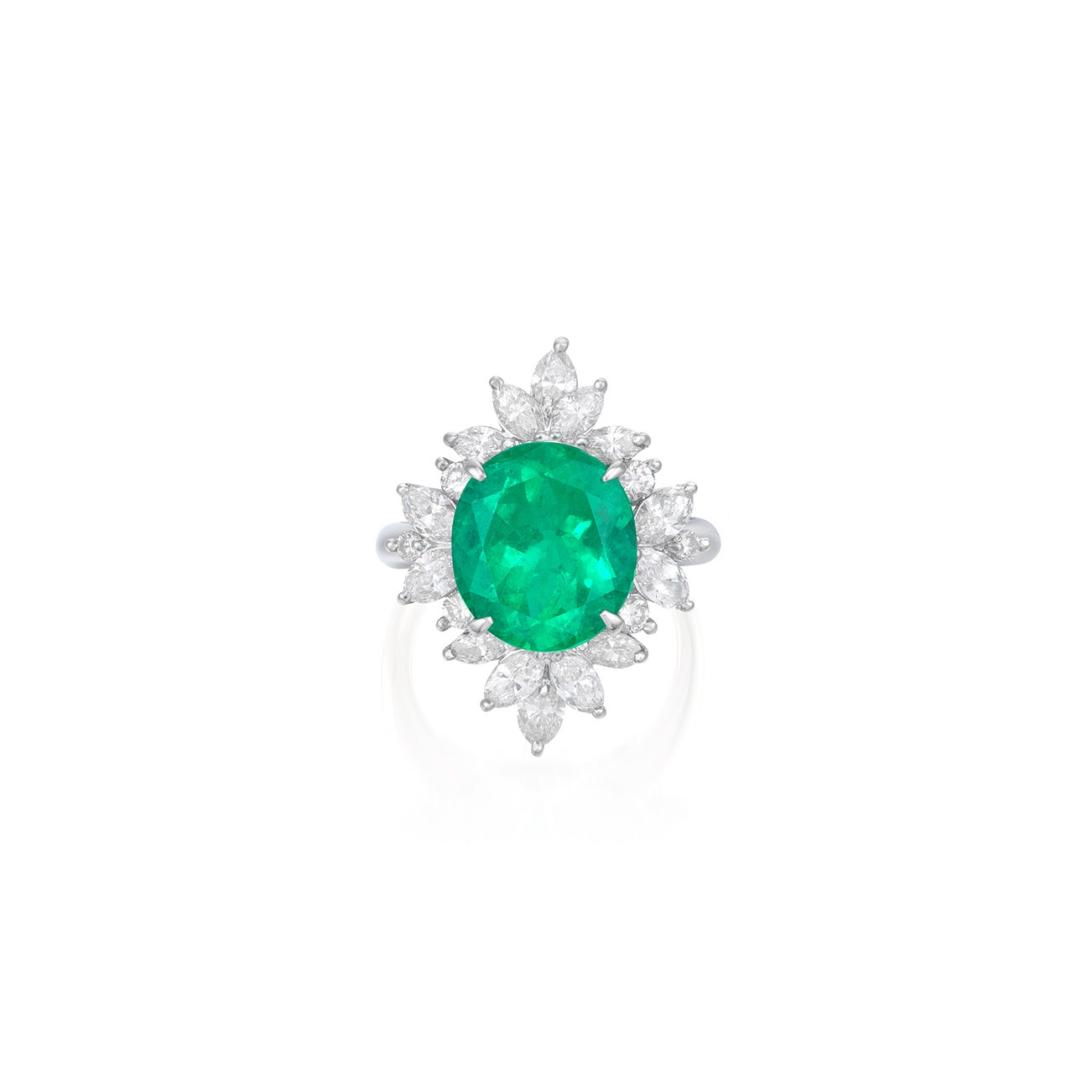 Set with an oval emerald weighing approximately 5.14 carats, surrounded by marquise-shaped and brilliant-cut diamonds, mounted in platinum, size 7¼.