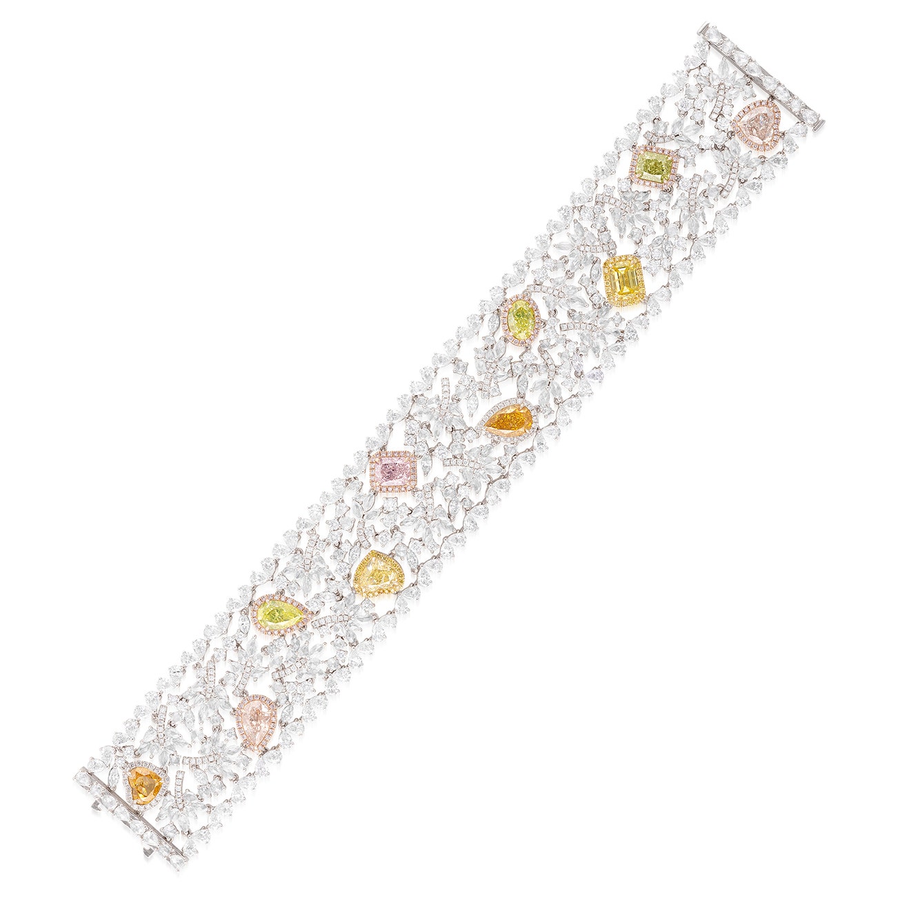 Set with ten variously shaped coloured diamonds, weighing from 1.06 to 1.00 carats, each to the surround of brilliant-cut diamonds or brilliant-cut diamonds of pink or yellow tint, decorated with variously shaped diamonds, mounted in white, pink and yellow gold, length approximately 173 mm.