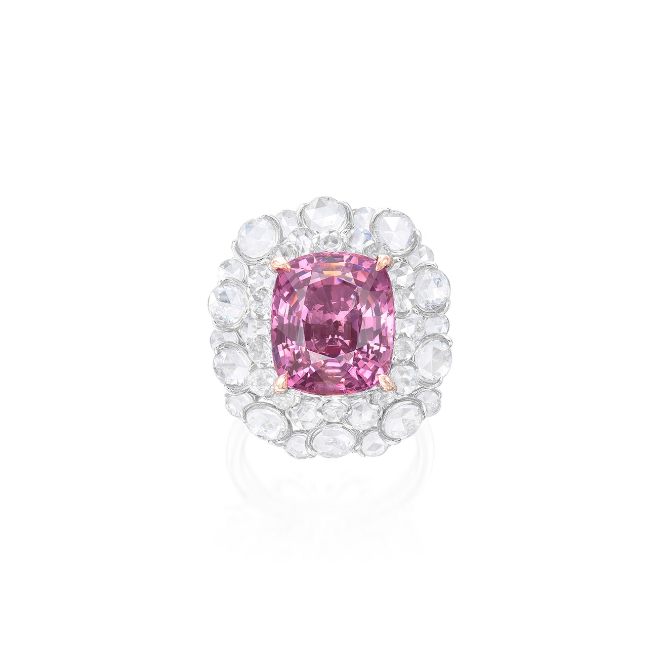 Set with a cushion-shaped spinel weighing 10.09 carats, to the rose-cut diamond surround, mounted in white and pink gold, size 6¾.