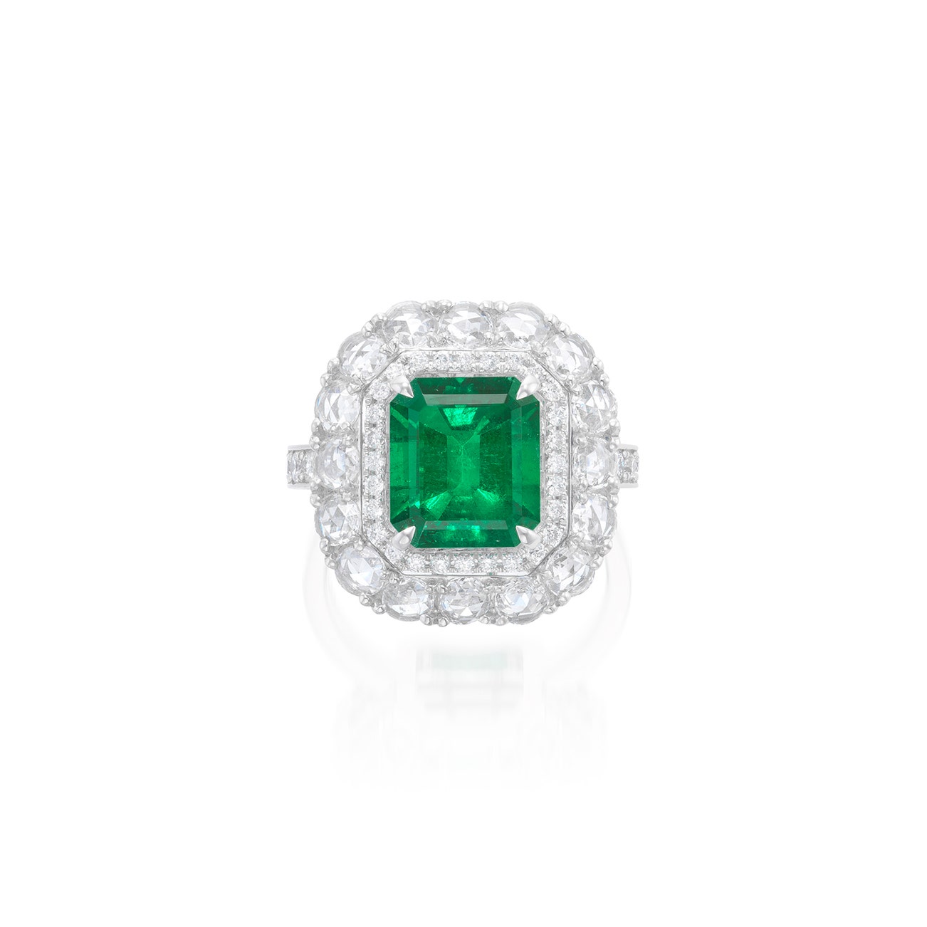 Set with a step-cut emerald weighing approximately 2.89 carats, within a double surround of rose- and brilliant-cut diamonds, to the brilliant-cut diamond shoulders, mounted in platinum, size 6½.