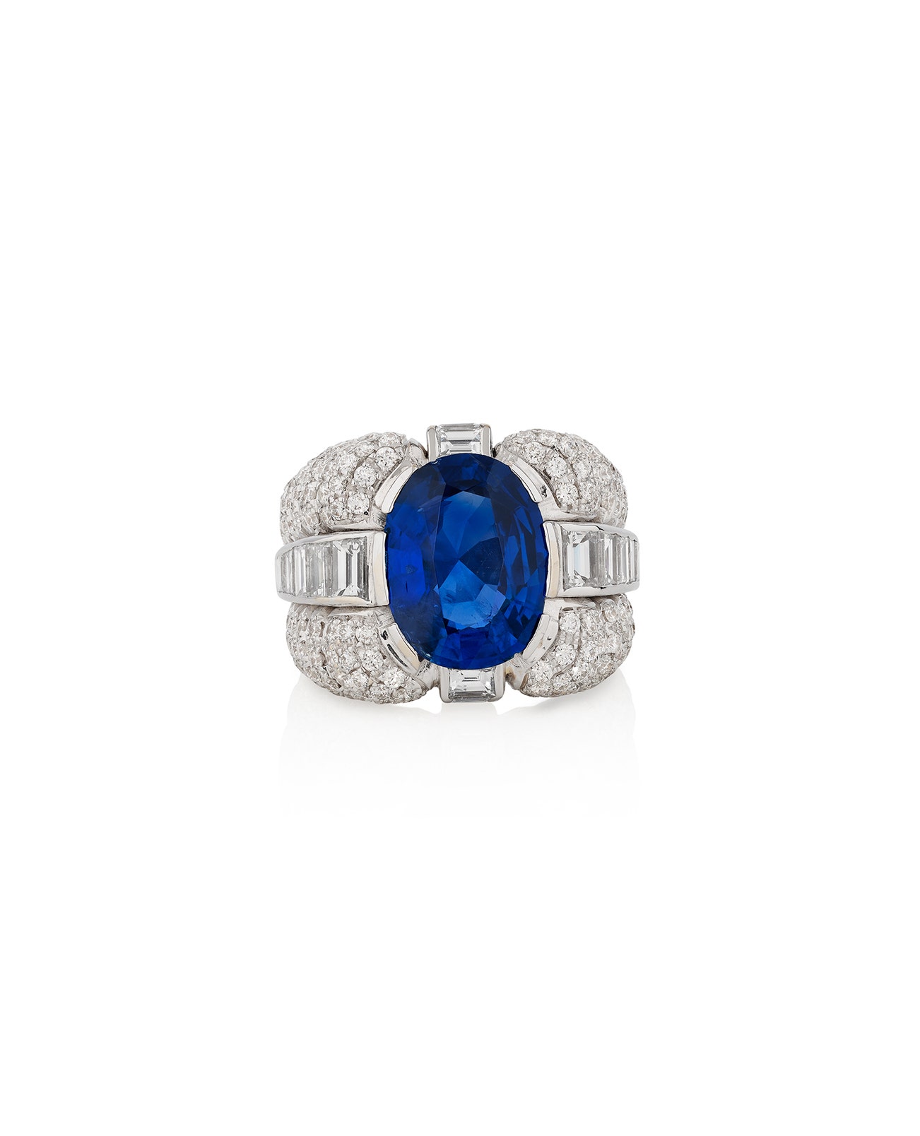 Set with an oval sapphire weighing 6.09 carats, highlighted with brilliant-cut and baguette diamonds, size 54.