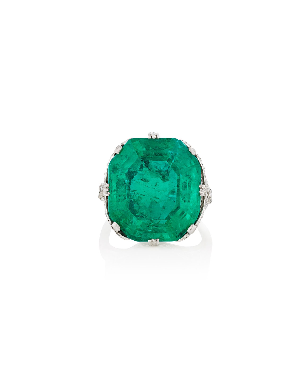 Set with an octagonal step-cut emerald weighing 16.88 carats, accented with single- and rose-cut diamonds, size 49.