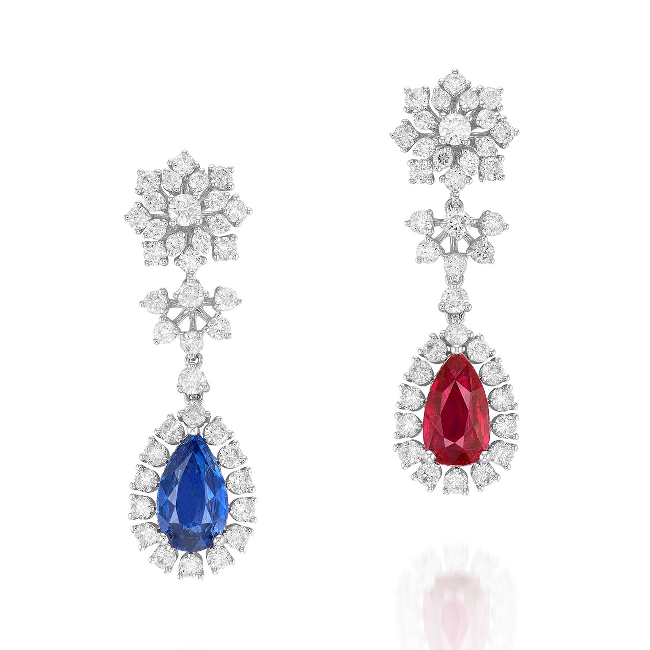 Each set with a pear-shaped sapphire or ruby weighing approximately 3.02 or 3.01 carats respectively, to the brilliant-cut diamond surround, surmount and top, mounted in white gold, post and butterfly fittings, length approximately 39 mm.