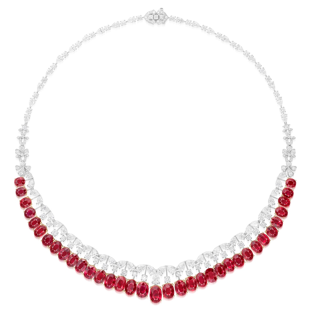 The front set with a fringe of thirty-five graduated oval and cushion-shaped rubies weighing approximately 38.80 carats in total, suspending from a line of pear-shaped and brilliant-cut diamonds, length approximately 400 mm.