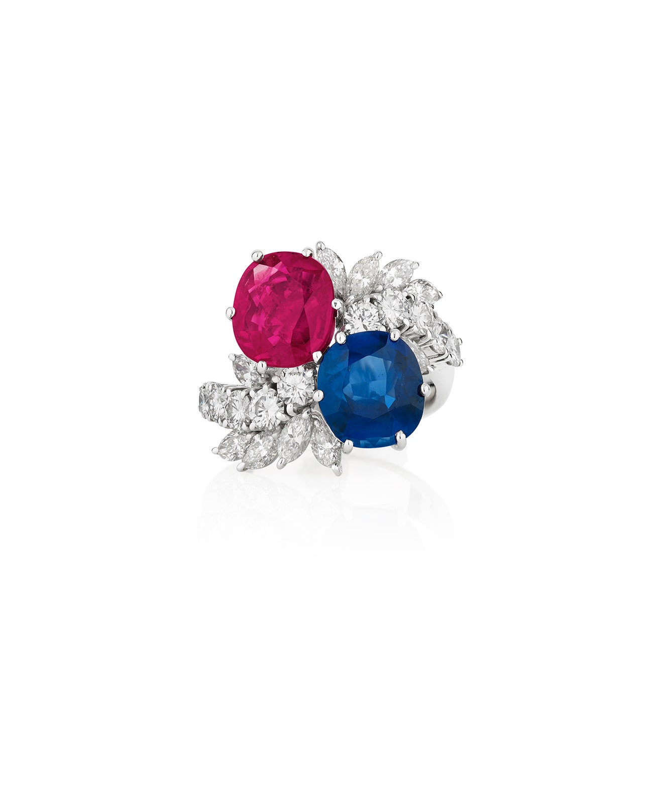 Set with a cushion-shaped ruby weighing 3.16 carats and a similarly shaped sapphire weighing 2.92 carats, accented with marquise-shaped and brilliant-cut diamonds, size 56.