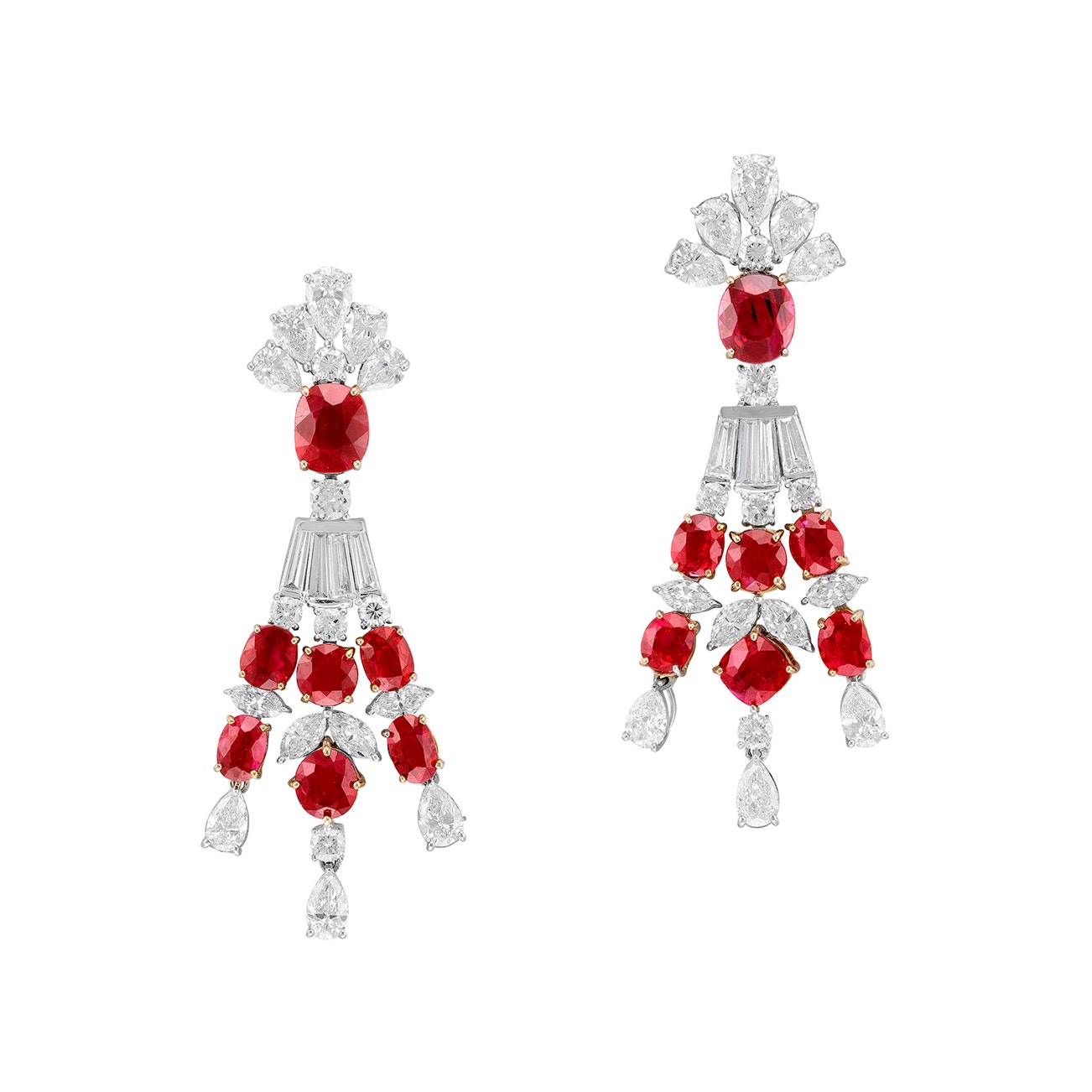 Each of chandelier design, set with fourteen oval, cushion-shaped and circular-cut rubies, embellished with variously shaped diamonds, mounted in white and yellow gold, post and hinged back fittings, length approximately 47 mm.