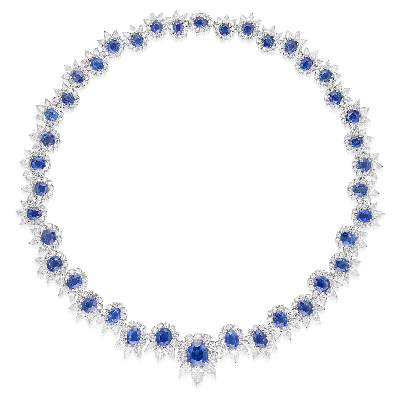Set with forty graduated cushion-shaped, oval and circular-cut sapphires, each surrounded with pear-shaped and brilliant-cut diamonds, length approximately 410 mm.