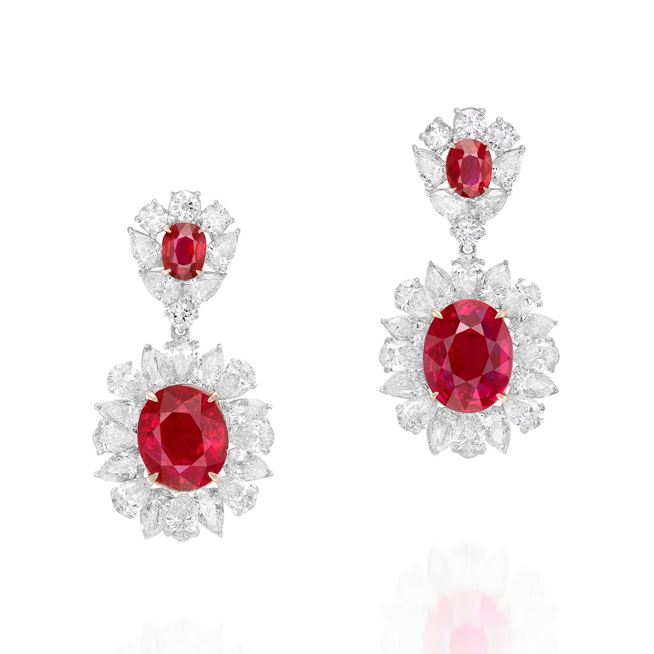 Each suspending an oval ruby weighing 4.01 and 3.23 carats respectively, within surround of pear-shaped diamonds, to the surmount set with a ruby weighing 0.64 or 0.65 carat, decorated with pear-shaped and brilliant-cut diamonds, mounted in white and yellow gold, post and hinged back fittings, length approximately 31 mm.