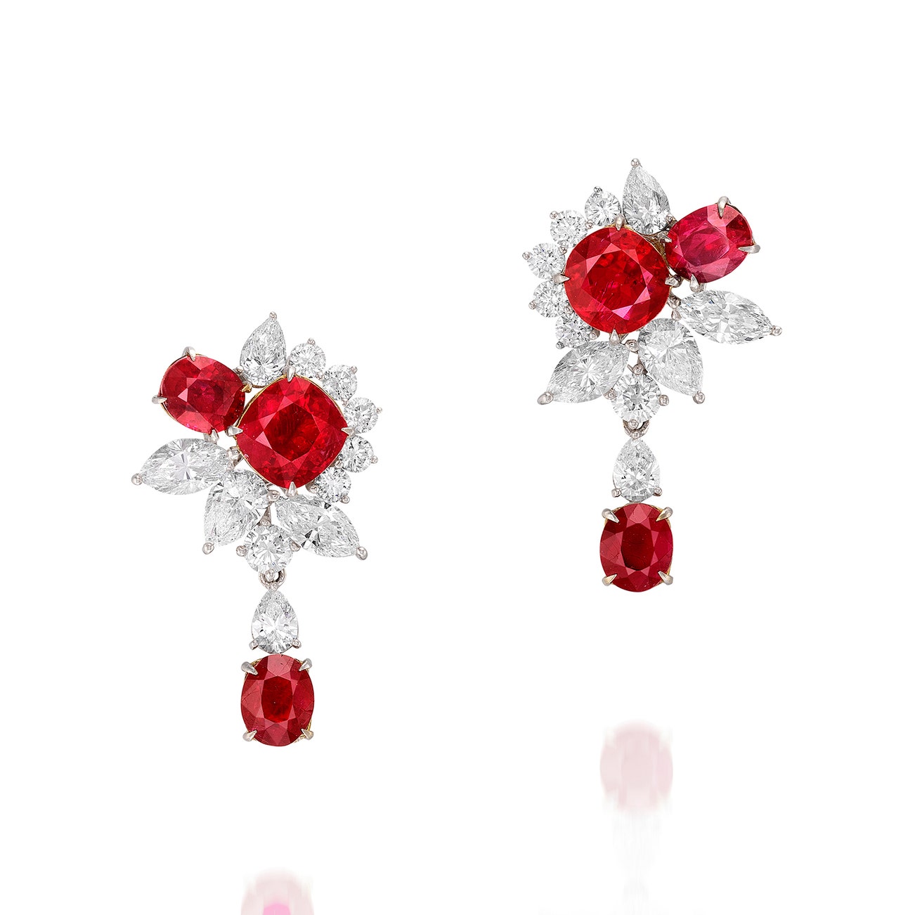 Each set with a cushion-shaped ruby weighing 1.42 and 1.21 carats respectively, decorated with oval rubies and variously shaped diamonds, post and butterfly fittings, length approximately 26 mm