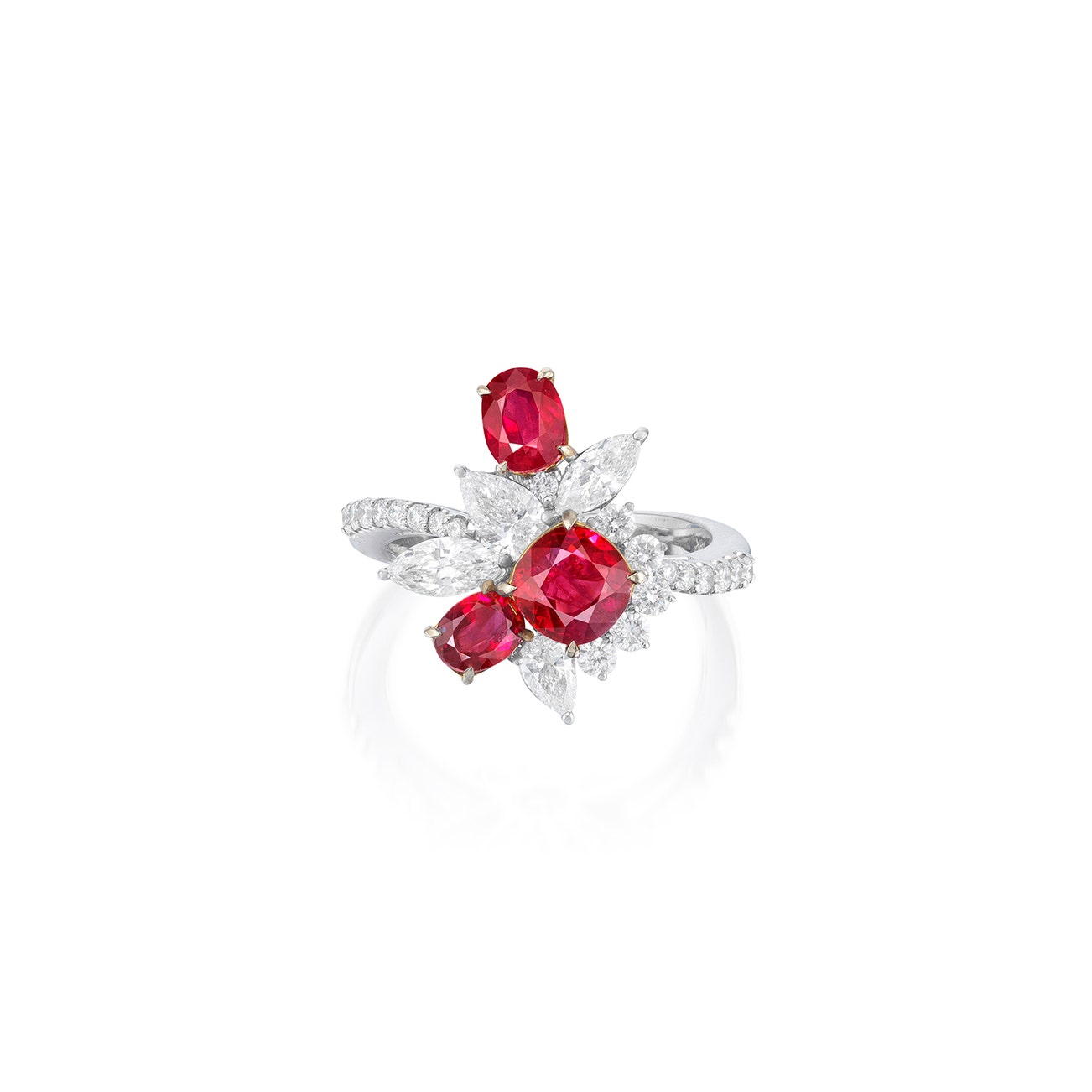 Set with a cushion-shaped ruby weighing 1.05 carats, decorated with oval rubies and variously shaped diamonds, to the brilliant-cut diamond bifurcated shoulders, mounted in white and yellow gold, size 6½.