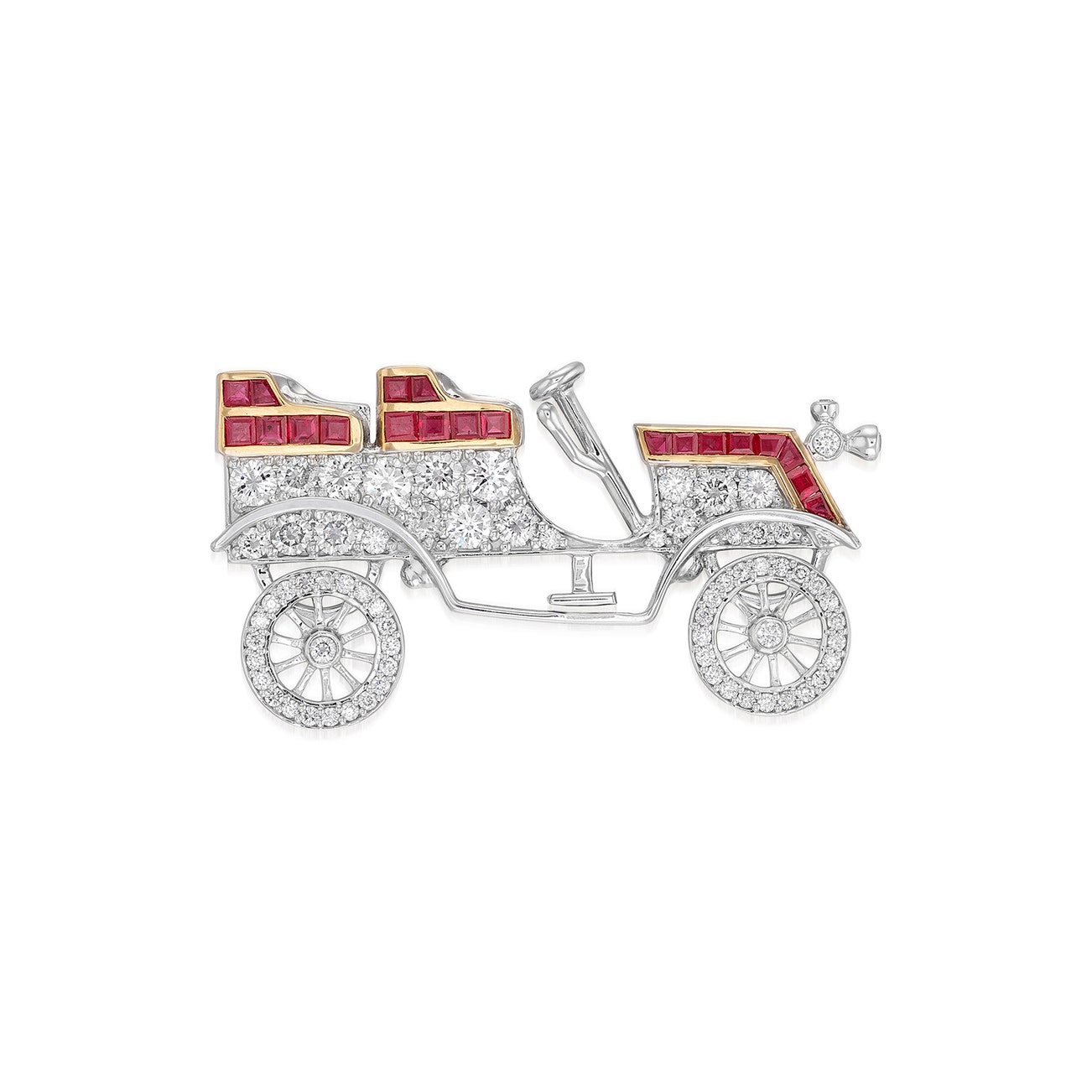 Designed as a carriage with rotatable wheels, decorated with calibré-cut rubies and brilliant-cut diamonds, mounted in white and yellow gold, length approximately 20 mm.