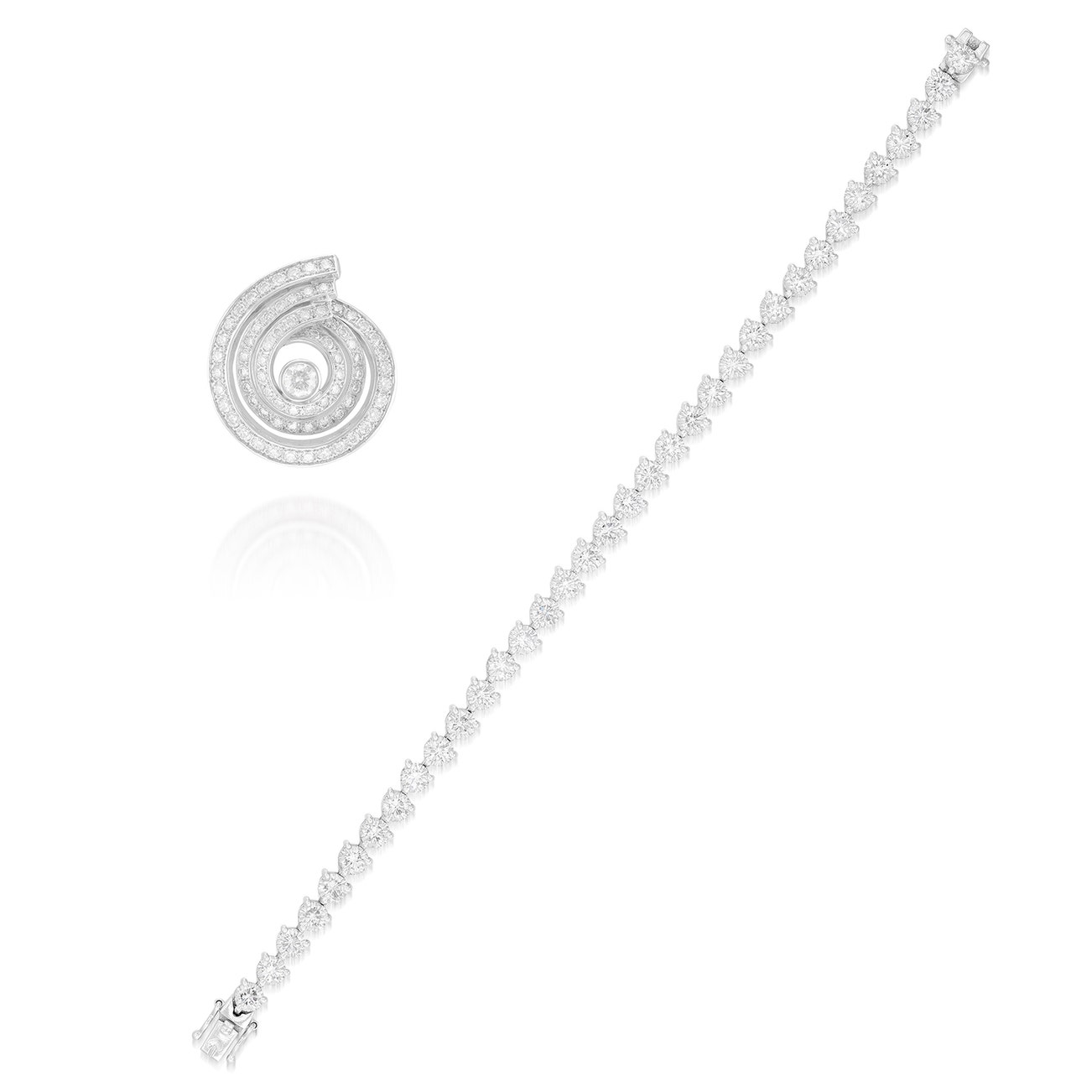 The pendant of spiral design, set with brilliant-cut diamonds, mounted in white gold, French assay and maker's marks; and the bracelet set with thirty-five brilliant-cut diamonds, pendant and bracelet length approximately 28 and 163 mm respectively.