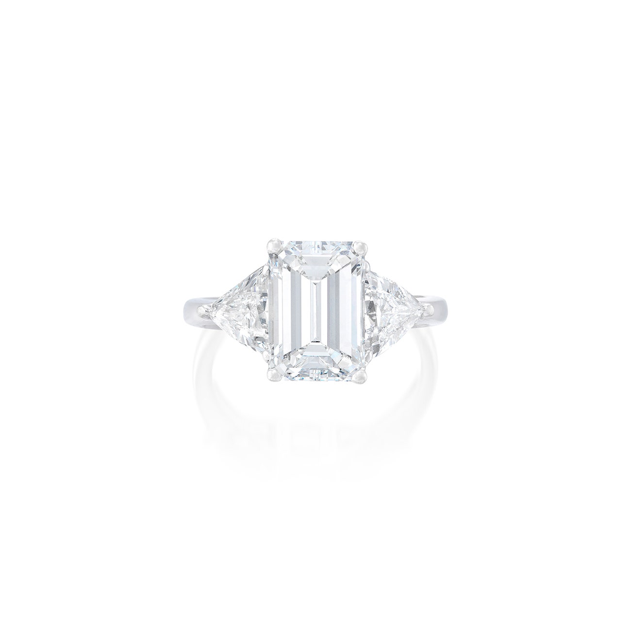 Set with an emerald-cut diamond weighing 2.77 carats, between two trilliant-cut diamonds, mounted in white gold, size 5¼.