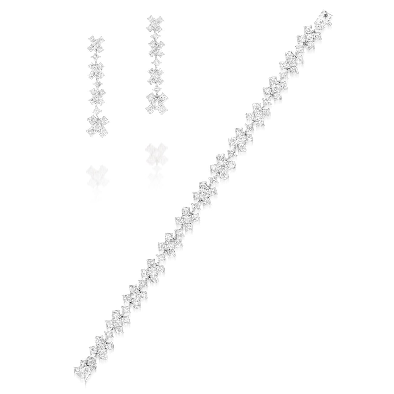 Comprising: a bracelet, designed as a line of brilliant-cut diamond floral motifs, spaced by princess-cut diamonds, mounted in white gold; and a pair of ear pendants en suite, ear pendants with post and butterfly fittings, bracelet and ear pendants length approximately 165 and 40 mm respectively.