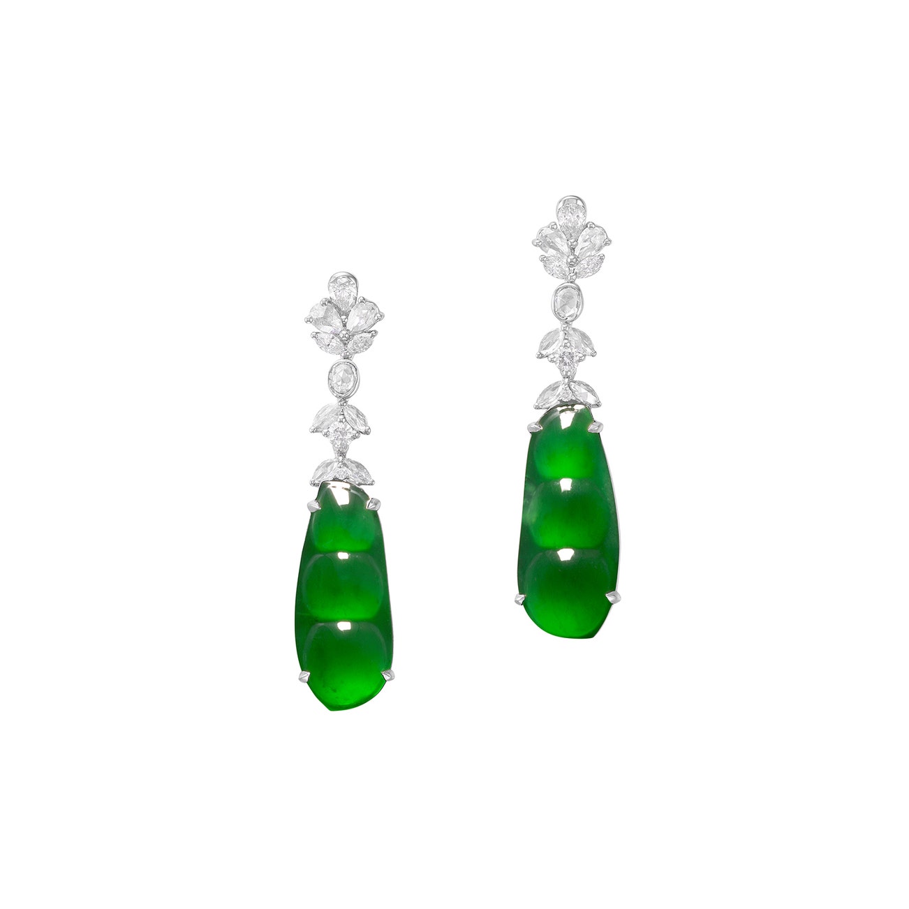 Each set with a jadeite peapod of intense green colour and very good translucency, suspended from a diamond-set surmount, mounted in white gold, post and butterfly fittings, length approximately 34 mm.