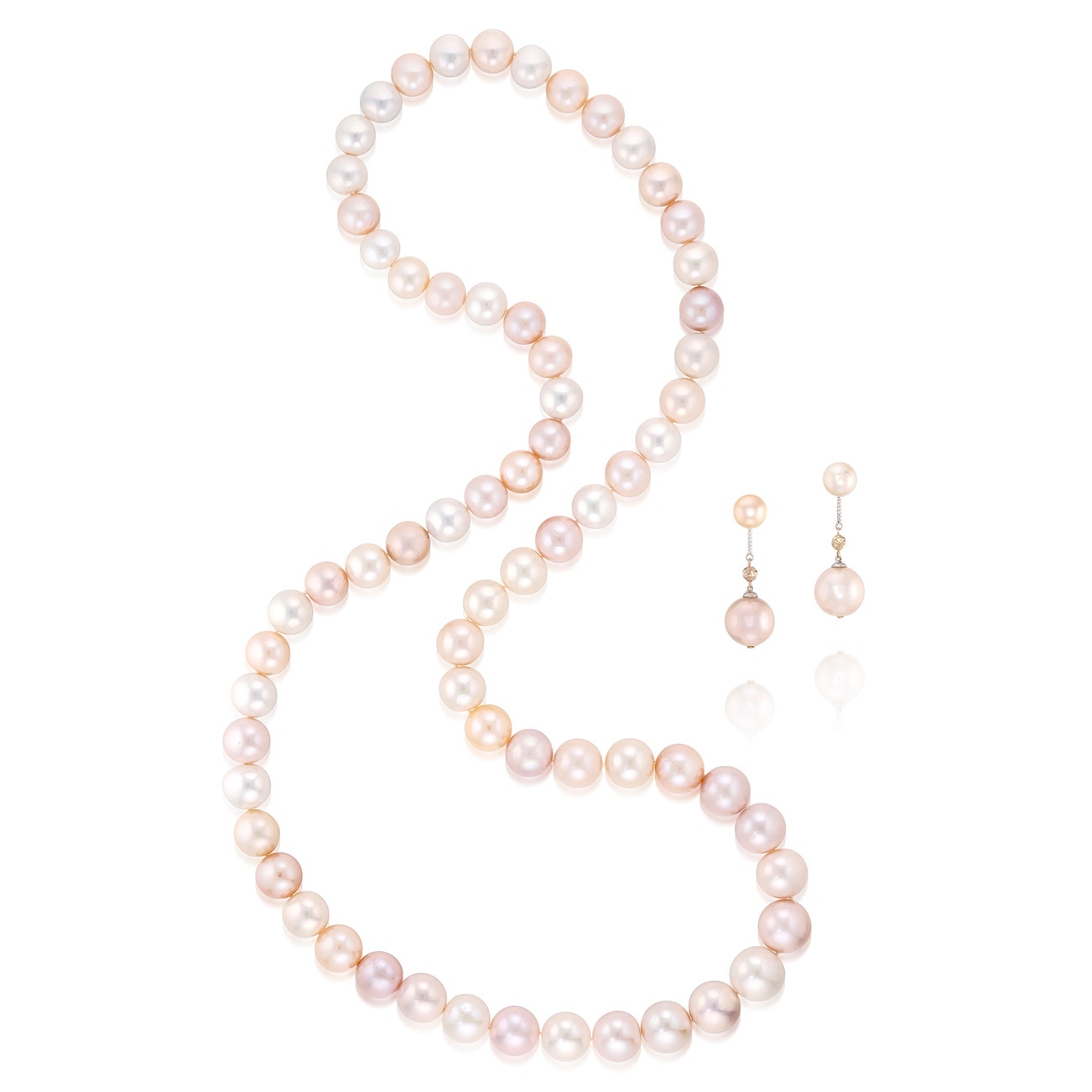 The sautoir composed of sixty-six graduated cultured pearls of various colours measuring approximately 14.70 to 10.77 mm, length approximately 780 mm; and pair of ear pendants each set with two cultured pearls of various colours, post and silicon fittings, length approximately 40 mm.