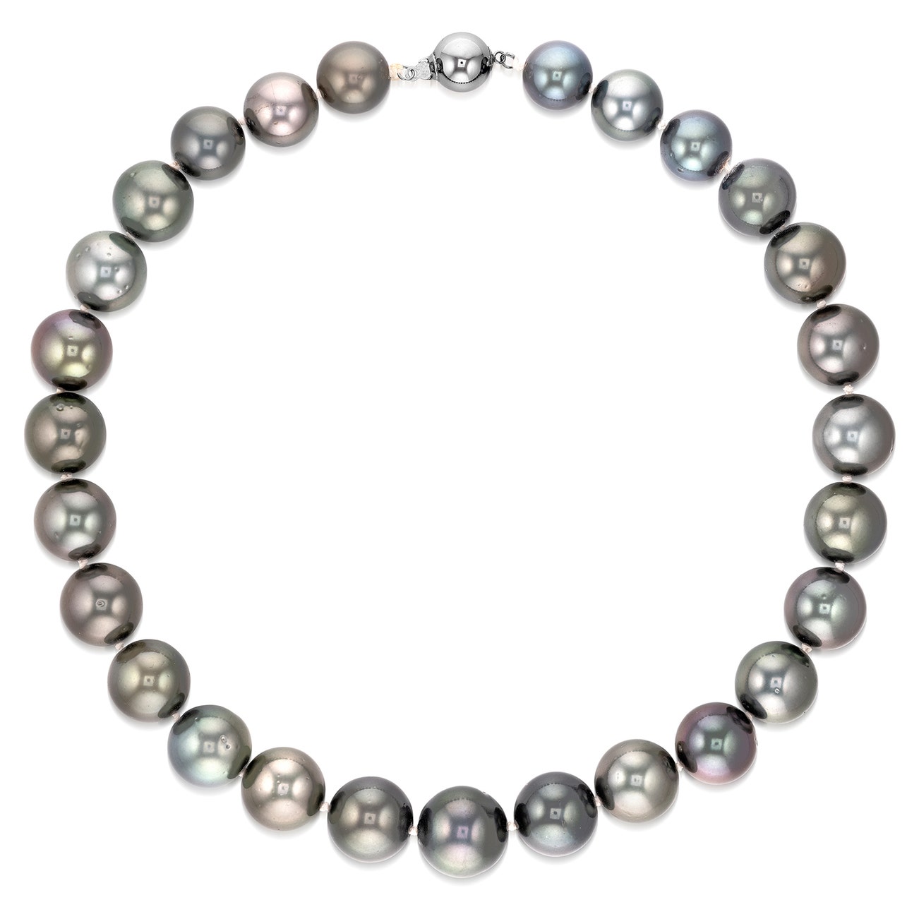Composed of twenty-seven graduated black pearls measuring approximately 15.22 to 11.61 mm, completed by a white gold boule clasp, length approximately 400 mm.
