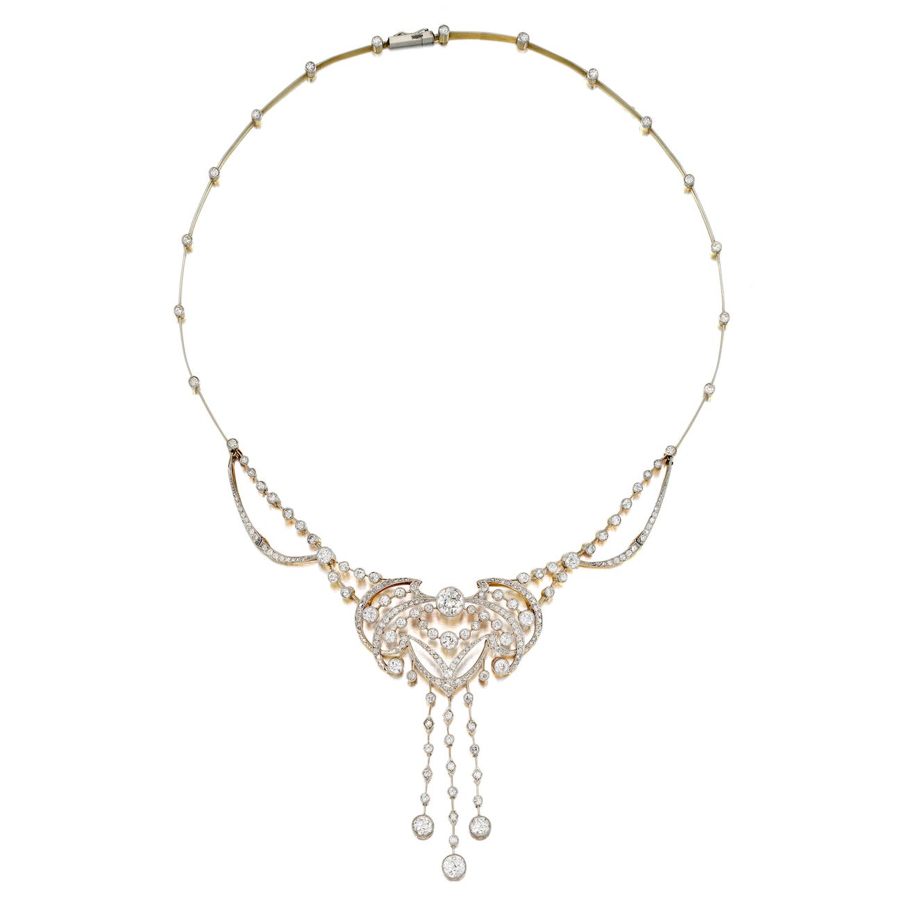 Of festoon design, set with circular-, single- and rose-cut diamonds forming a scroll motif, supporting articulated swags embellished with single- and circular-cut diamonds, connected to a articulated single-line chain, mounted in platinum and 18K yellow gold, length approximately 16 inches.