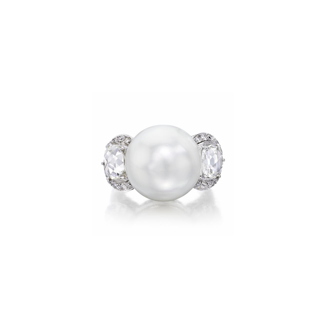Set with a button-shaped cultured pearl measuring approximately 15.90-15.95mm, between rose-cut diamonds, accented with brilliant-cut diamonds, mounted in 18k white gold, size 8.