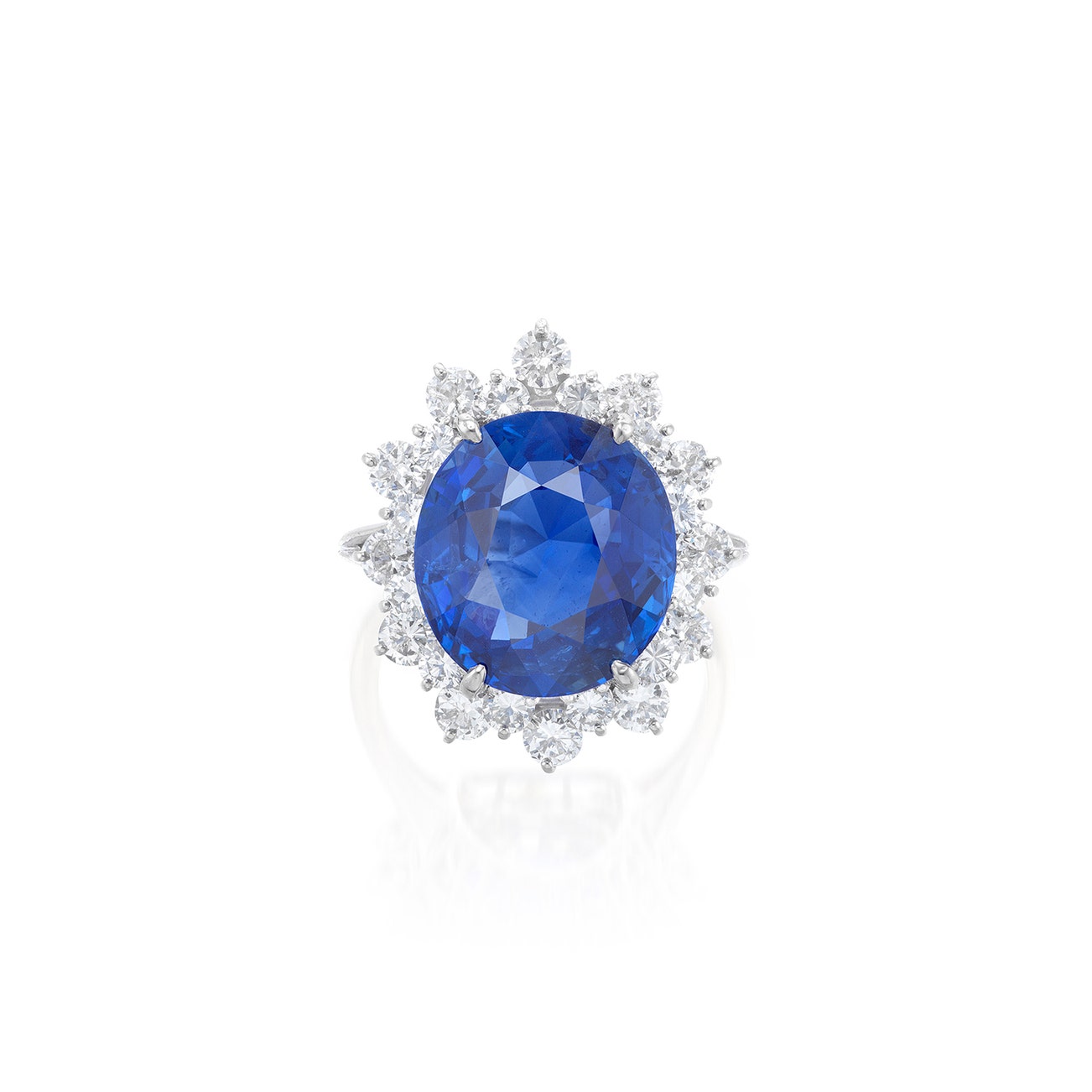 Set with an oval sapphire weighing 16.04 carats, surrounded by brilliant-cut diamonds, mounted in white gold, French assay mark, size 9.