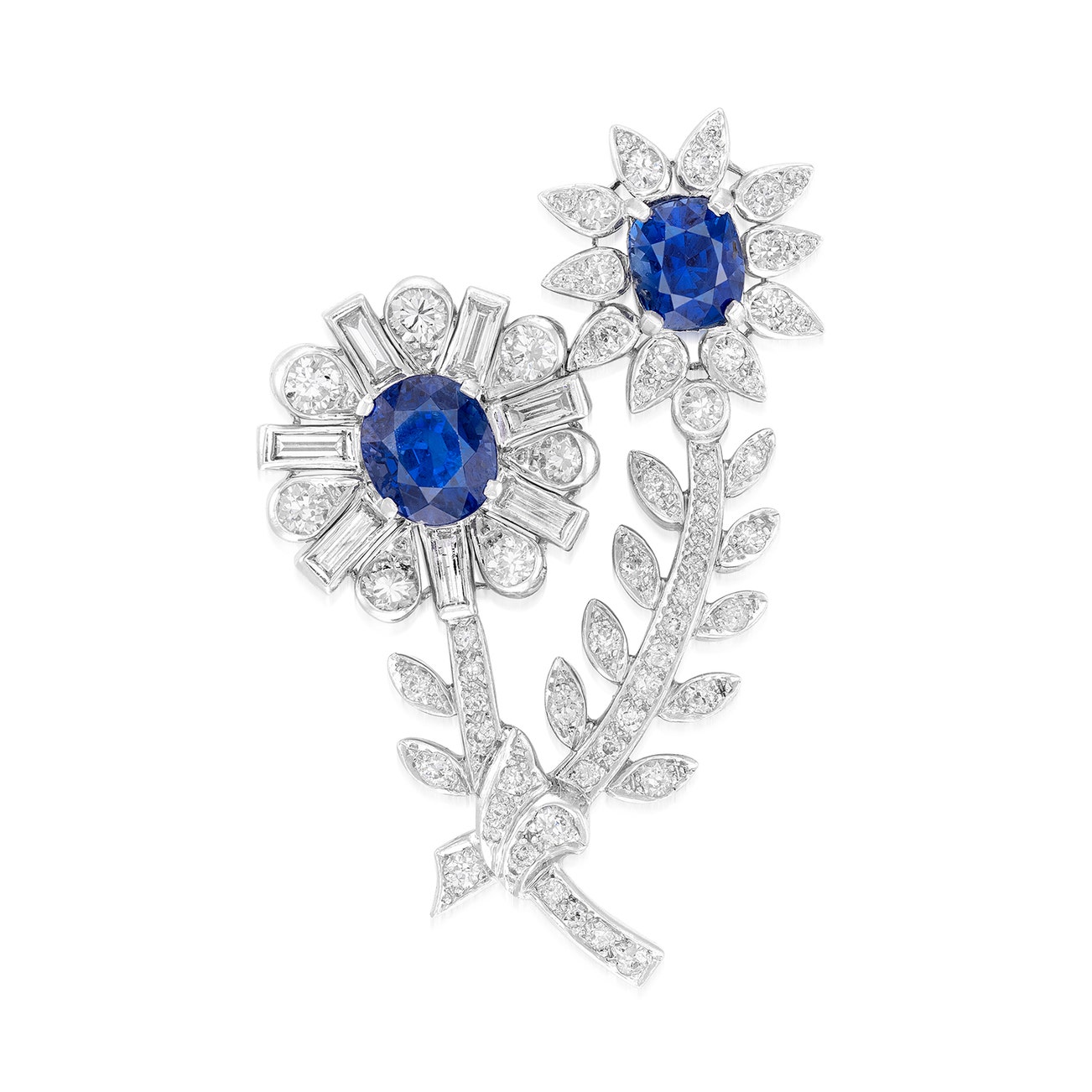 Designed as two flowers, each centring upon a cushion-shaped sapphire weighing approximately 3.20 and 2.03 carats respectively, petals, stems and leaves decorated with brilliant-cut and baguette diamonds, length approximately 49 mm.