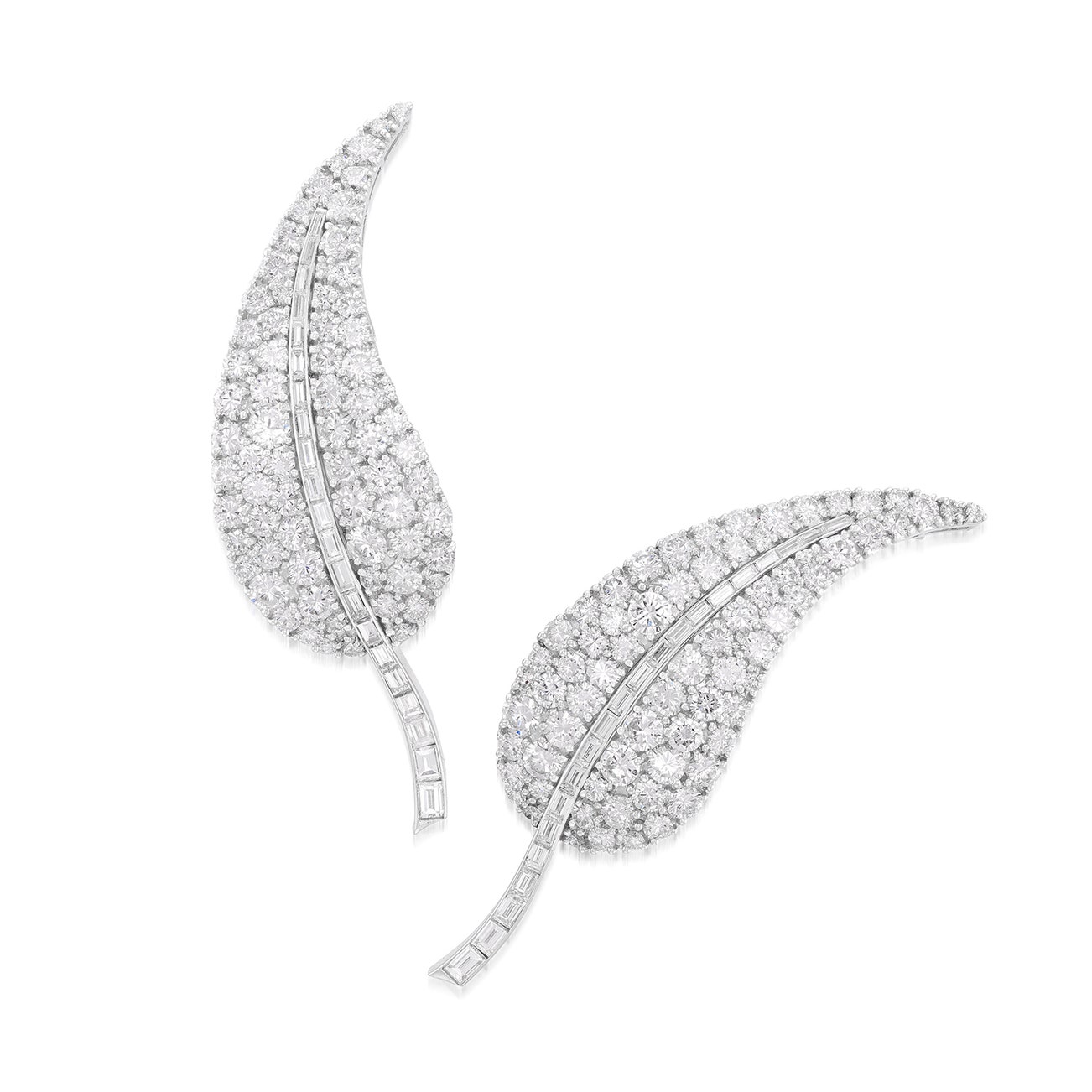 Each of foliate design, set with brilliant-cut and baguette diamonds, mounted in platinum, French assay marks, length approximately 63 mm.