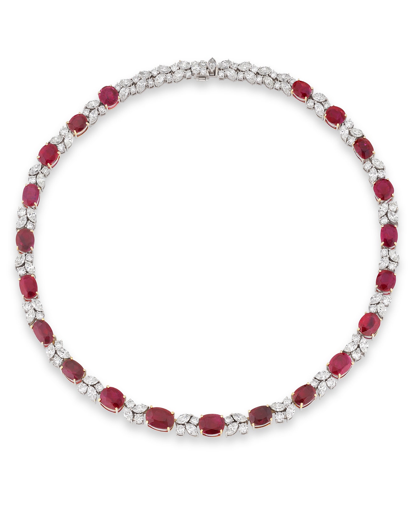 Set with oval and cushion-shaped rubies, highlighted with marquise-shaped and brilliant-cut diamonds, length approximately 418mm.