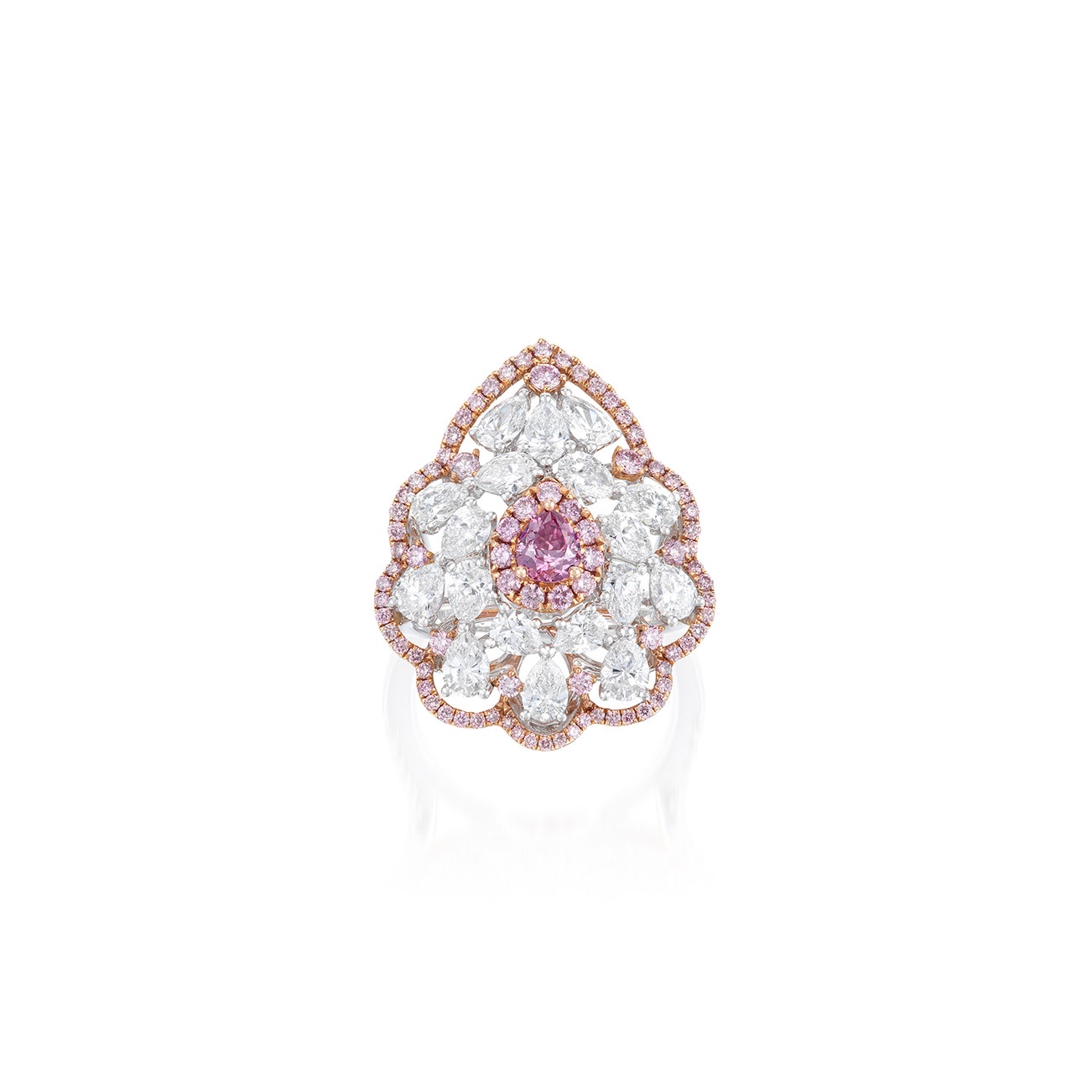 Set with a pear-shaped fancy vivid purplish pink diamond weighing 0.32 carat, within surrounds of pear-shaped diamonds and brilliant-cut diamonds of pink tint, to the brilliant-cut diamond gallery and shoulders, mounted in platinum and pink gold, size 6¼.