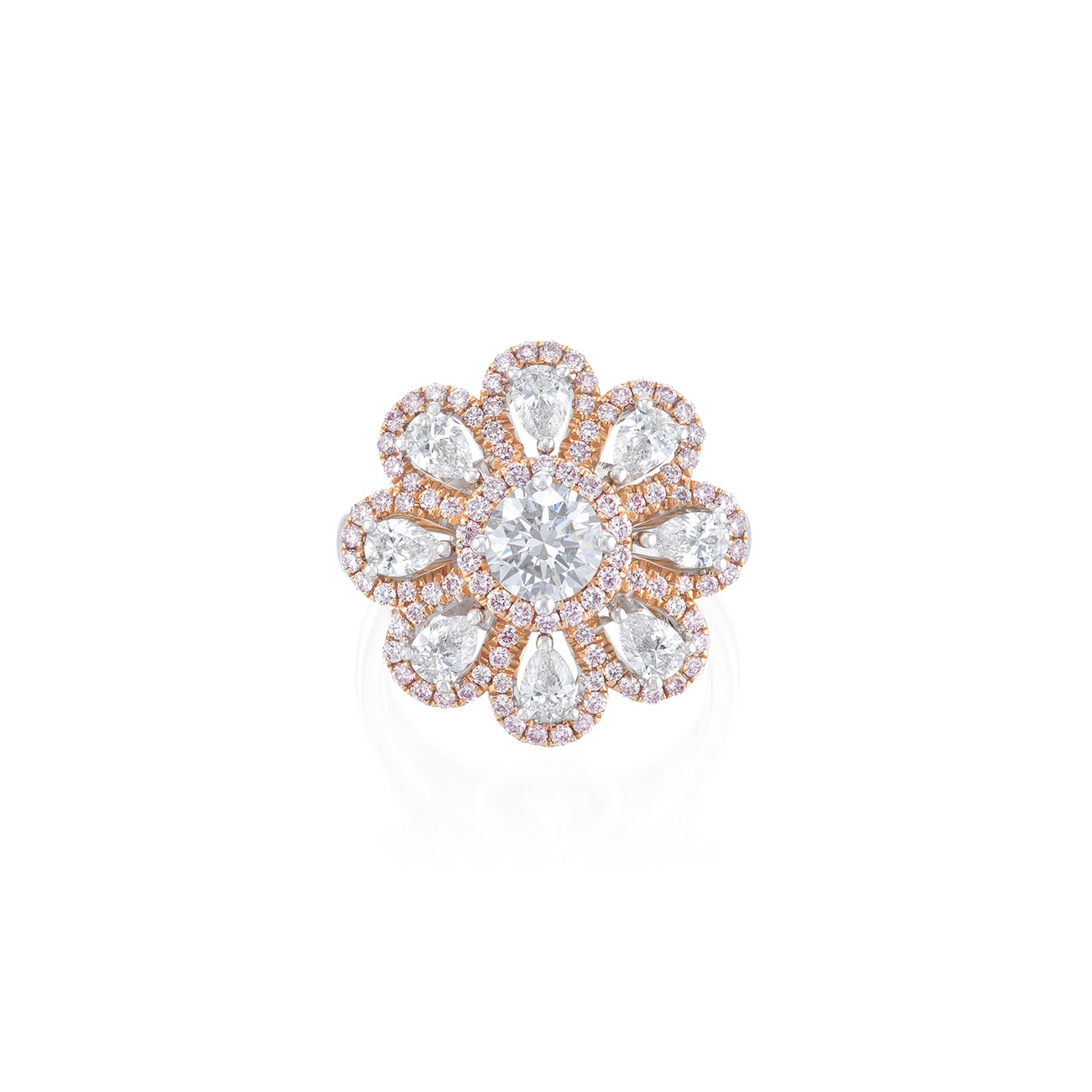 Designed as a flowerhead, centring upon a brilliant-cut diamond weighing 0.66 carat, petals set with pear-shaped diamonds and brilliant-cut diamonds of pink tint, to the brilliant-cut diamond shoulders, mounted in platinum and pink gold, size 6.