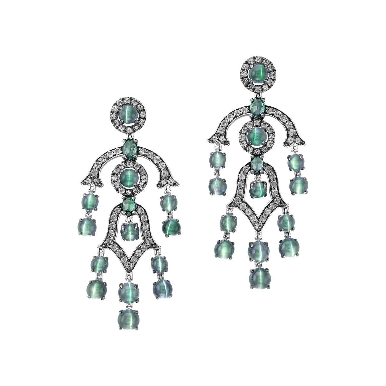 Each of chandelier design, set with round cabochon cat's eye alexandrite chrysoberyls weighing approximately 11.00 carats in total, embellished with circular-cut and oval alexandrite chrysoberyls, mounted in white gold, post and butterfly fittings, length approximately 48 mm.