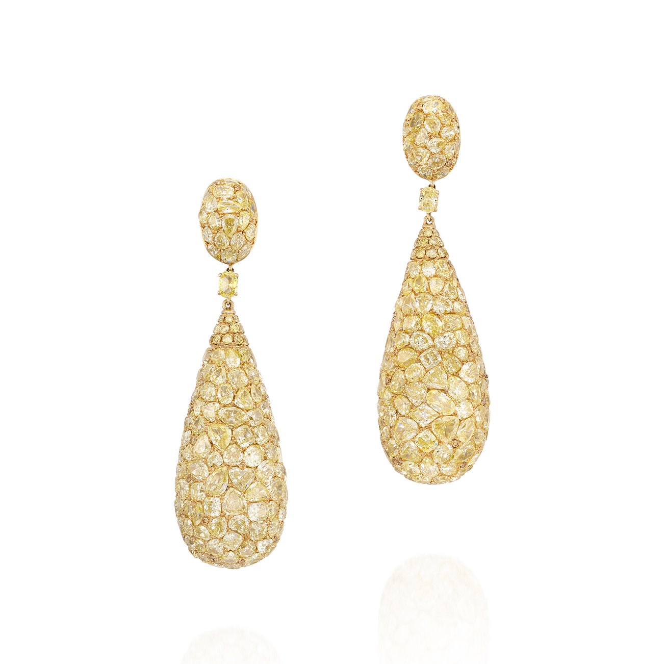 Each set with variously shaped diamonds of yellow tint, mounted in yellow gold, post and screw back fittings, length approximately 67 mm.