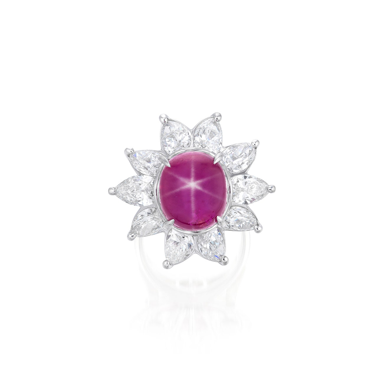 Set with an oval cabochon star ruby weighing approximately 8.54 carats, to the pear-shaped diamond surround, mounted in platinum, size 6¼.