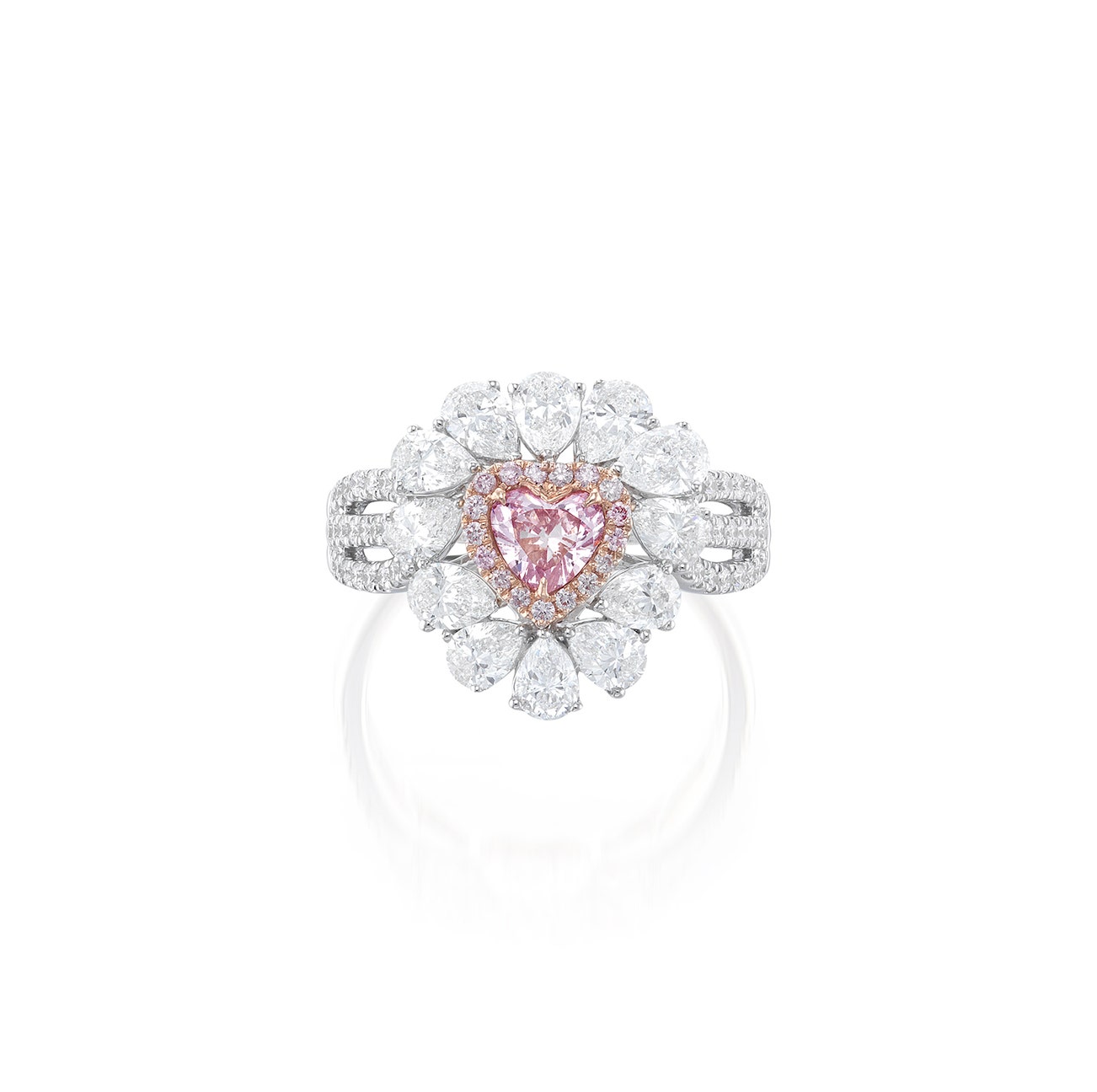 Set with a heart-shaped fancy intense pink diamond weighing 0.40 carat, framed by brilliant-cut diamonds of pink tint, to the pear-shaped diamond surround and brilliant-cut diamond shoulders, mounted in white and pink gold, size 6½.