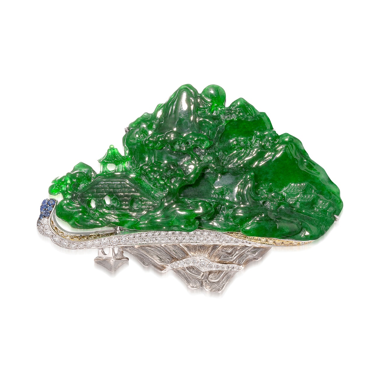 Set with a carved jadeite plaque of intense green colour, depicting lustrous landscapes and a serene pavilion, decorated with brilliant-cut diamonds and circular-cut sapphires and coloured sapphires, mounted in white and yellow gold, length approximately 36 mm.