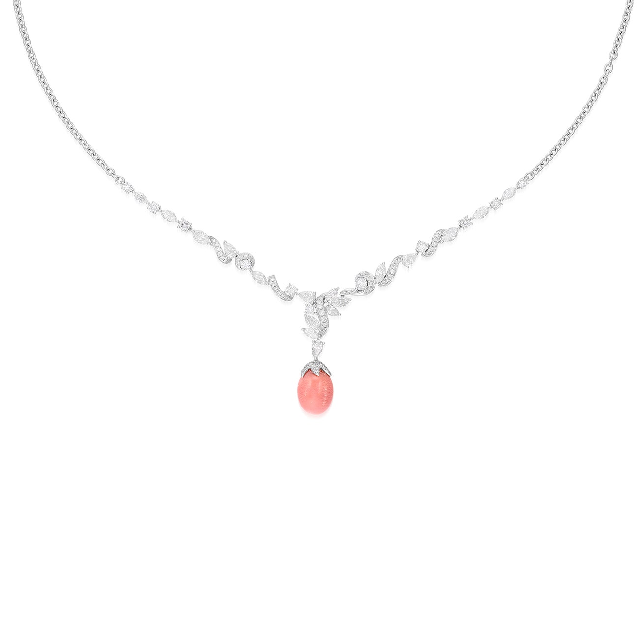 The pendant set with an oval conch pearl, to the diamond-set surmount, link chain decorated with variously shaped diamonds, mounted in white gold, pendant length approximately 25 mm, link chain maximum length approximately 452 mm.